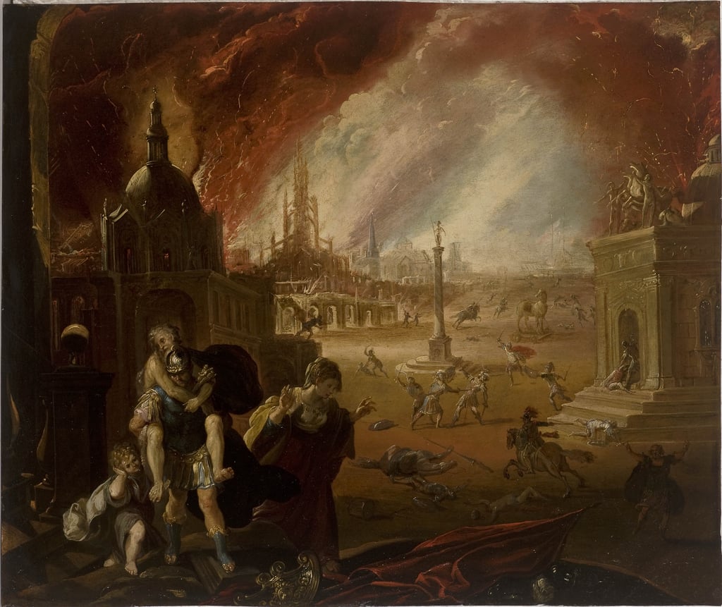 Der Flug von Aeneas, mit dem Fall von Troja dahinter (Öl auf Kupfer)