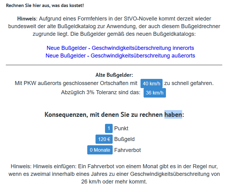 16 km/h zu schnell innerorts und außerorts Bußgeld etc.