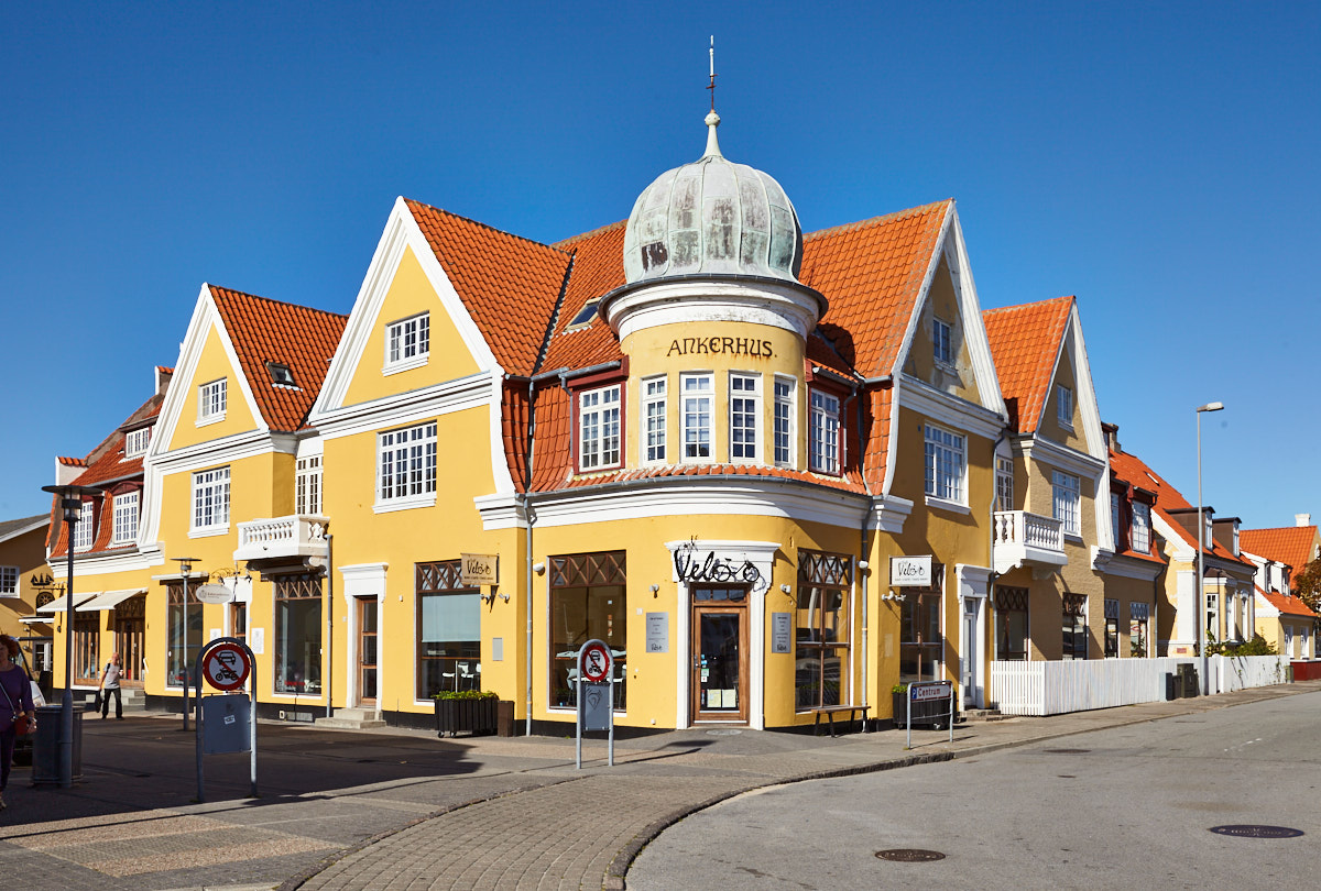 Ankerhus in Skagen (Nordjütland, Dänemark) bei wolkenlosem blauem Himmel Foto & Bild gelb