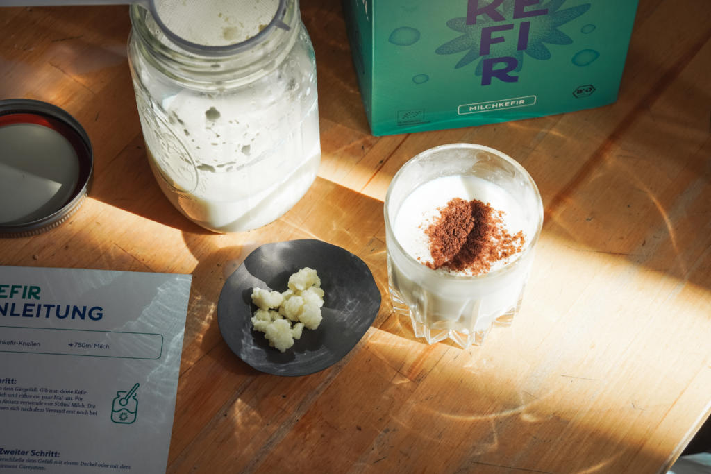 Für 500 ml selbst gemachten Kefir benötigst du: 8 g deines Kefirpilzes. 500 ml Bio-H-Milch oder abgekochte Bio-Milch. Schritt 1. Lege die Kefirpilze in dein Einmachglas und gib die Milch dazu. Schritt 2. Spanne etwas Wachstuch fest über die Öffnung des Glases und fixiere sie mit dem Gummi.