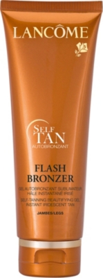 Product description. Product code: 46015258. Achieve a healthy summer glow all year round with our natural-looking, facial self-tanner, Lancôme Flash Bronzer. Lancôme's sunless tan gel helps you achieve a gorgeous even glow, in just an hour. The formula contains a DHA self tanning agent and moisturisers to help soften and smooth the skin.