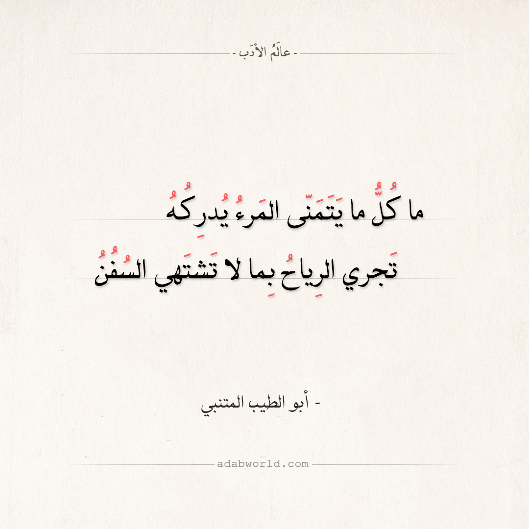 واحد من ابيات الشعر التي قالها ابي الطيب المتنبي، وهو واحد من أشهر الشعراء في العصر العباسي، وقد قال في شعره، ما كل ما يتمنى المرء يدركه تجري الرياح بما لا تشتهي السفن. كما ان بيت الشعر ذلك هو دليل على ان ظروف الحياة.